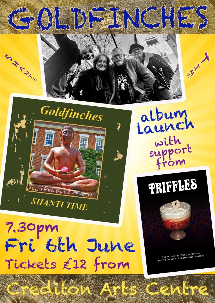 Goldfinches are thrilled to announce that Tony’s Buddha will ‘manifest’ at our album launch gig at Crediton Arts Centre on Friday 6th June. It should be a very special occasion, bringing together the band’s Bristolian songs with the ‘genius loci’ of where the album was recorded. Our opening act for the evening will be Crediton’s very own Triffles, who describe themselves as “suppliers of sundry songs silly, sarcastic and (sometimes) sincere”. We hope to see you there.